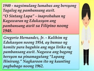 Lupang Hinirang Official version used since 1956 Bayang magiliw Perlas ng Silanganan Alab ng puso Sa dibdib moy buhay. Saan unang inawit ang Lupang 9. Ituloy lamang ang kwentuhan habang itinataas ang watawat 5.