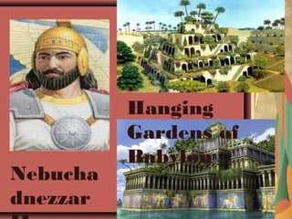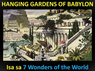 Libreng sagot saAP - 6586699 Libreng sagot saAP Siya ang nagpagawa sa Hanging Garden of Babylon. Nakabiting halamanan na itinayo sa tuktok ng bubungan ng mga gusaliIpinagawa i2 ni nebuchadnezzar para sa kanyang asawa upang maaliw nangungulila sa kanyang sinilangan ang. Isa sa Pitong Ancient Wonders of the World.