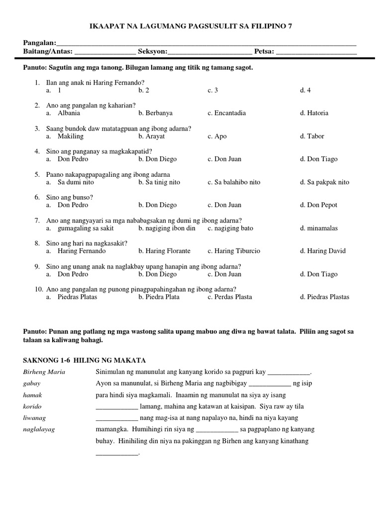 Ibong Adarna Mga Tulong Sa Pag Aaral Quiz Per Chapter With Answers