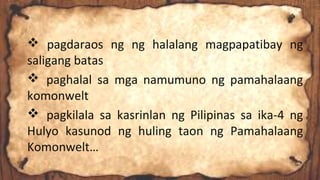 PAGTATAG NG PAMAHALAANG KOMONWELT 2. Philippine Bill 1902 Jones Law 1916 Philippine Assembly 1907 Pamahalaang Komonwelt Constitutional Convention 1935 Hare-Hawes-Cutting Law 1932 Tydings-McDuffie Law 1934 Misyong OSROX 1931 3. Siya rin ang unang pinunong Pilipino na namahala ng buong kapuluan ng Pilipinas.