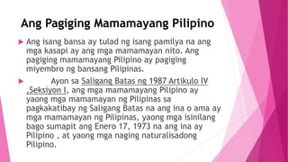 Nang mapagtibay ang Saligang Batas ay mamamayan na. Ang Mamamayang Pilipino Ang Pagiging Mamamayang Pilipino 2. Ang salingang batas ang batayan sa.