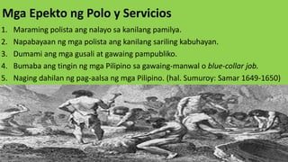 Ang Buwis Sapilitang nagbabayad ng buwis o tribute ang ating mga ninuno bilang pagkilala sa kapangyarihan ng Espanya Ang halaga ng buwis noon ay walong reales Piso o mahlagang bagay 10. Bilang kapalit ang encomendero ay maaring magpataw at maningil ng buwis mula sa mga katutubo at manghikayat ng mga manggagawa para sa polo y servicios.