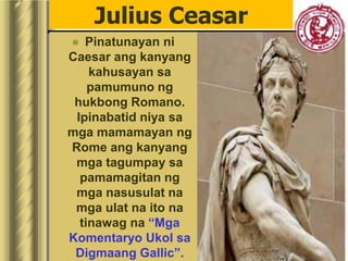 Susi siya sa pagbagsak ng Republikang Romano tungo sa pag-usbong ng Imperyong RomanoIpinalawak ng kaniyang pagsakop ng Gallia ang daigdig. Isang pulitiko at namuno sa asya. Peter the Great 1672-1725 4.