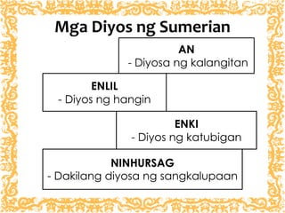Mga Diyos ng Sumerian AN - Diyosa ng kalangitan ENLIL - Diyos ng hangin ENKI - Diyos ng katubigan NINHURSAG - Dakilang diyosa ng sangkalupaan 8. At ito ay ang malakas na diyos ng langit ay ang panginoon ng mga konstelasyon at hari ng mga diyos na nakatira sa tabi ni Antu kanyang asawa. Tinanghal nya ang sarili bilang hari.
