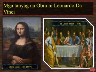 Mga tanyag na Obra ni Leonardo Da Vinci The Last Supper 1498 Mona Lisa 1503-1507 24. Nagpinta ng The Last Supper at Mona Lisa 9. Leonardo da Vinci Si Leonrdo da Vinci ang nagpinta ng The Last supper 1498 at Mona Lisa 1503-1507.