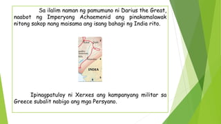 Sino ang pinuno ng persian na nagpagawa ng isang royal road. Kauna unahang kabihasnan sa buong. - Hinati ang mga imperyo sa mga lalawigan o satrapy at pinamahalaan ng gobernador o satrap. - Napatanyag din ang mga Persian sa.