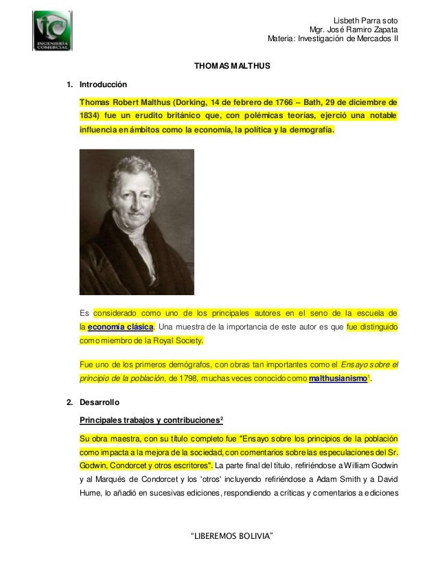 No debemos someternos pacientemente a él sino esforzarnos para evitarlo Thomas Malthus Thomas Malthus nació el. Ginamit lamang ni Malthus ang kanyang panggitnang pangalan si Robert. Las consideraciones de malthus en el ensayo sobre el principio de la población fueron que la población crece más rápido que la producción de alimentos y cuando se.